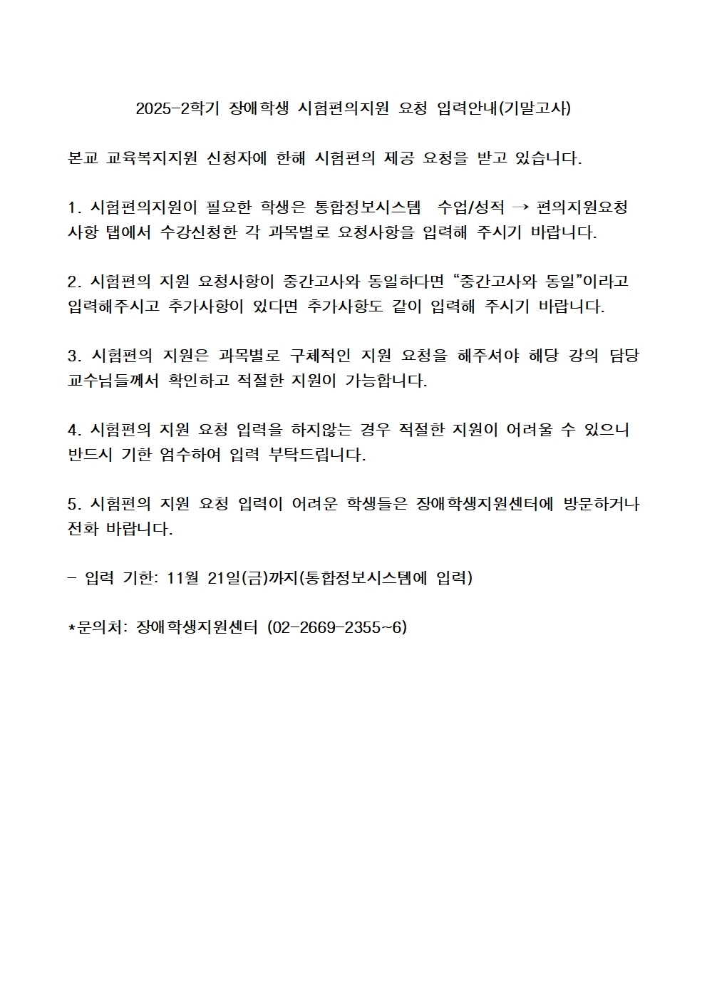2025-2학기 기말고사 시험편의지원요청 입력안내