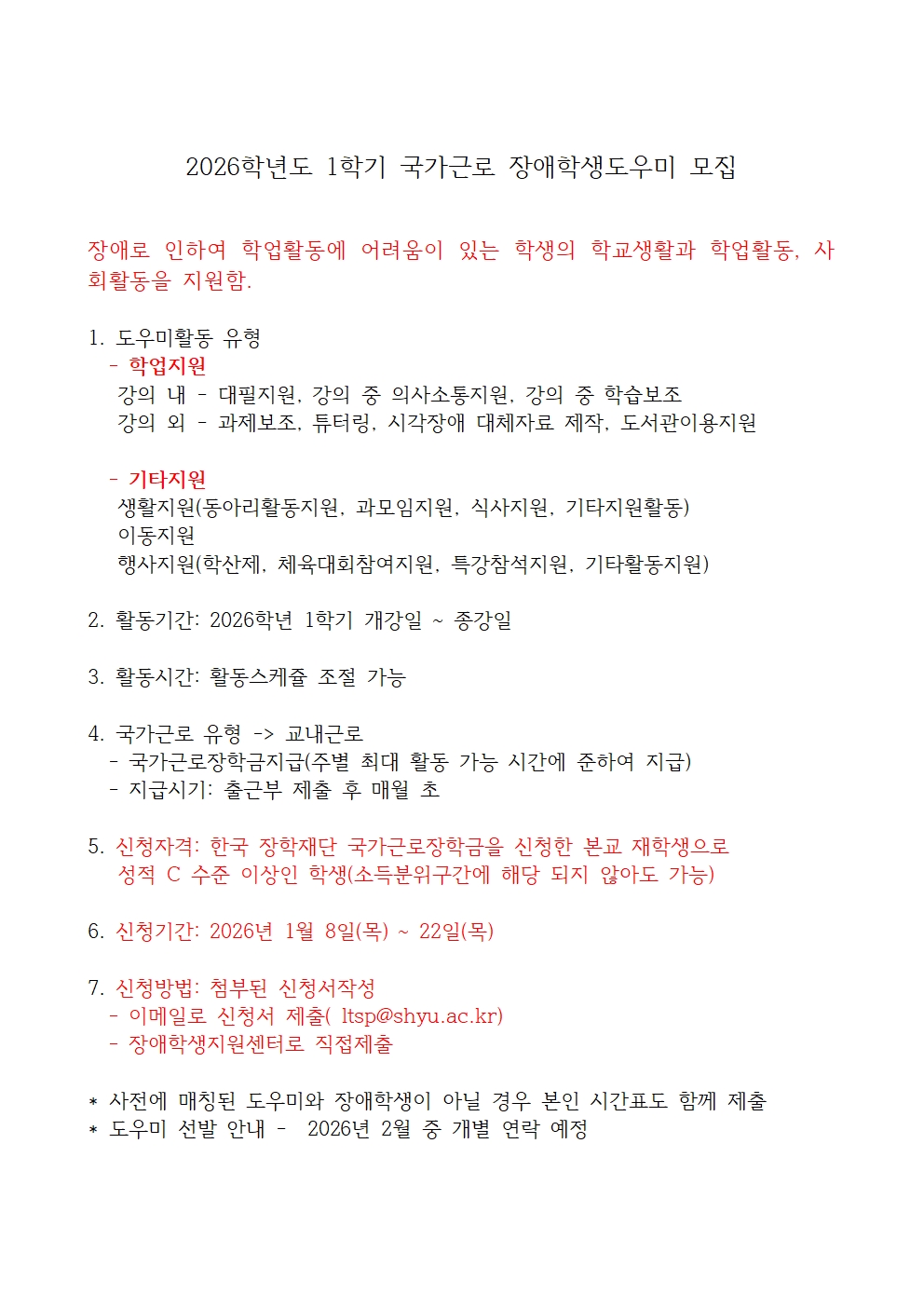 2026-1학기 국가근로 장애학생도우미 모집안내